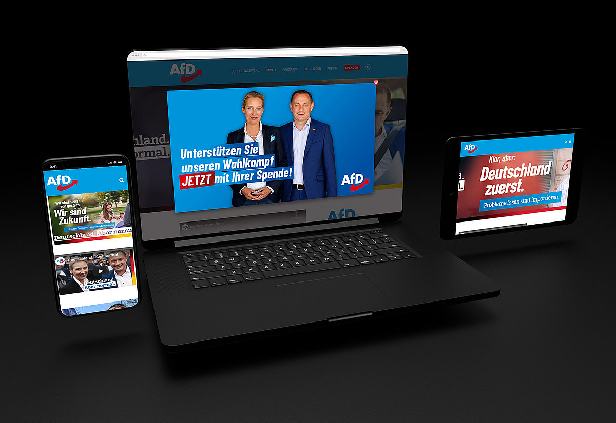 Die Website der AfD ist technisch gut und spiegelt das Parteibild wieder. Der Einstieg ist laut und konzentriert sich auf emotionale und plakative Aussagen. Unterhalb des großen Headers befinden sich Videos, Nachrichten oder die Top-Themen.