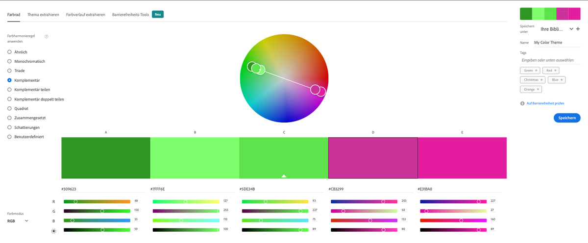 Eine weitere gute Möglichkeit sind Online-Tools wie Adobe Color. Bei Adobe Color kann man mithilfe verschiedener Farbschemata das richtige Design finden und es direkt auf das Kontrastverhältnis prüfen.