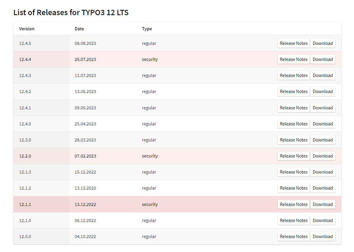 Durch ein Servicelevel Agreement werden Sicherheitspatches oder Updates in regelmäßigen Abständen automatisch installiert. Mithilfe einer Roadmap (https://get.typo3.org/list/version/12) der TYPO3 GmbH wird deutlich, zu welchem Zeitpunkt verschiedene Aktualisierungen veröffentlicht werden, welche Art von Aktualisierungen es sind (Security-, Bugfix-, Wartungs- oder Funktionsaktualisierungen) und welche präzisen Änderungen im Detail durchgeführt werden.