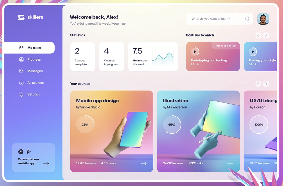 Farbverläufe feiern ein stilvolles Comeback. Ob subtil oder auffällig, sie verleihen Designs eine moderne und zugleich zeitlose Note. Besonders beliebt: Kombinationen aus Neonfarben und soften Pastelltönen für einen futuristischen Touch. Farbverläufe werden häufig in Hintergrundelementen, Call-to-Action-Buttons oder als Akzente eingesetzt, um Tiefe und Dynamik zu erzeugen. Ein eindrucksvolles Beispiel zeigt das abgebildete Design, bei dem sanfte Verläufe aus Blau, Rosa und Gelb nahtlos ineinander übergehen. Diese Technik verleiht der Benutzeroberfläche ein modernes und harmonisches Erscheinungsbild, das sowohl Kreativität als auch Benutzerfreundlichkeit vermittelt.