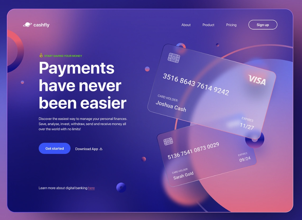 Glastexturen, bekannt als Glassmorphism, sind ein eleganter Weg, um Transparenz und Tiefe zu erzeugen. Dieser Trend kombiniert Schlichtheit mit einem Hauch von Luxus und eignet sich besonders gut für moderne Interfaces. Elemente mit halbtransparenten Hintergründen, kombiniert mit schimmernden Farbverläufen, verleihen Designs eine futuristische und zugleich elegante Wirkung. Das gezeigte Design illustriert diesen Ansatz perfekt: Die halbtransparenten Kreditkarten schweben vor einem Hintergrund aus sanften Farbverläufen und erzeugen so ein Gefühl von Leichtigkeit und Modernität. Diese Kombination fördert nicht nur die visuelle Ästhetik, sondern hebt auch wichtige Inhalte gezielt hervor.