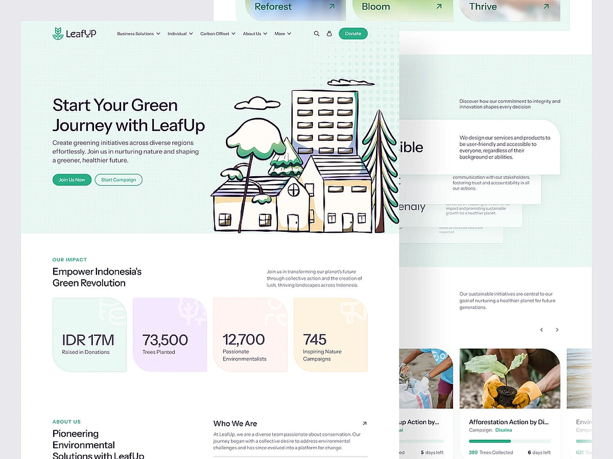 Auf der anderen Seite bleiben weiche, beruhigende Pastelltöne beliebt. Sie sorgen für ein angenehmes Nutzungserlebnis und schaffen Vertrauen – ideal für Wellness-, Beauty- oder Lifestyle-Websites. Pastellfarben lassen sich hervorragend mit minimalistischen oder skandinavisch inspirierten Designs kombinieren. Ein anschauliches Beispiel bietet das gezeigte Design, das mit zarten Grün- und Blautönen eine natürliche und einladende Atmosphäre schafft. Die sanften Farben harmonieren perfekt mit den klaren Linien und den handgezeichneten Elementen, wodurch eine Balance zwischen Professionalität und Verspieltheit entsteht.