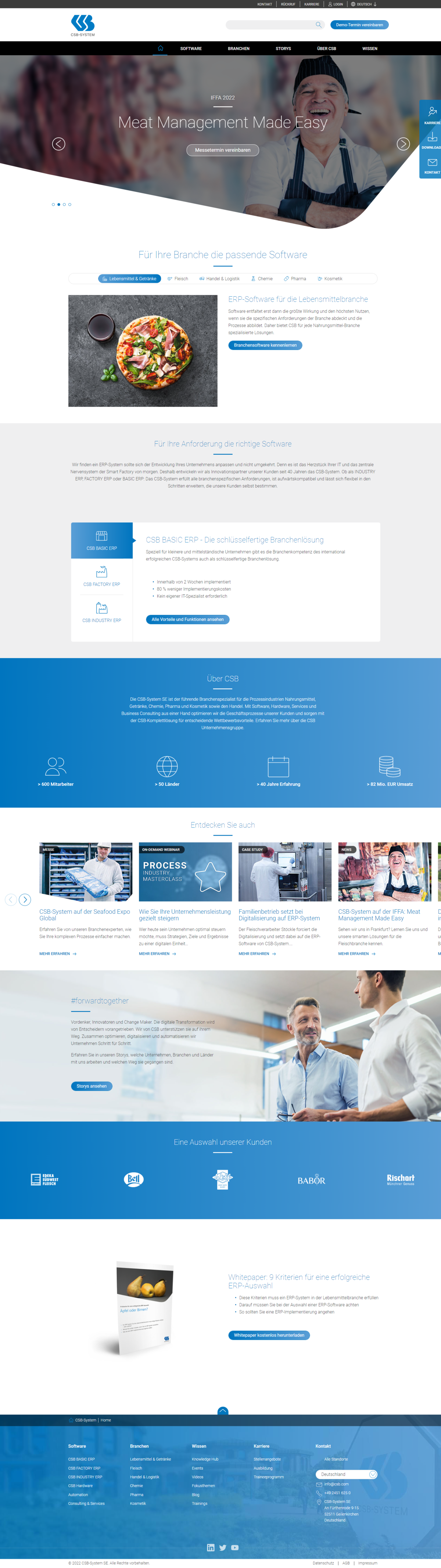 Die CSB-Systeme AG optimiert die Geschäftsprozesse ihrer Kunden mit Software, Hardware, Services und Business Consulting aus einer Hand. Und das als führender Branchenspezialist für die Prozessindustrien Nahrungsmittel, Getränke, Chemie, Pharma, Kosmetik und Handel. Mit dem Relaunch möchte der Softwarehersteller bestehende und potenzielle Kunden auch online mit einem modernen und klaren Erscheinungsbild überzeugen. Daraus ergaben sich für uns folgende Aufgaben:
