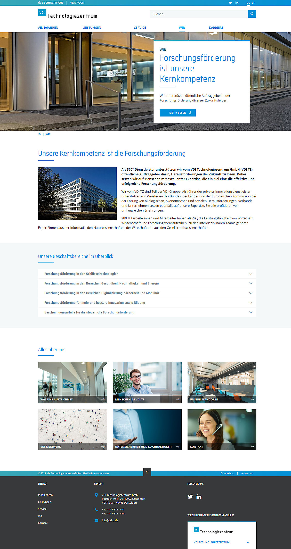 Das Ziel des Relaunchs war einerseits, die Gruppenzugehörigkeit des Technologiezentrums zum Verein Deutscher Ingenieure grafisch zu stützen und andererseits, die komplexen und hochtechnischen Dienstleistungen durch eine durchdachte Struktur, ein klares Design und intuitive Funktionen schneller begreifbar zu machen.